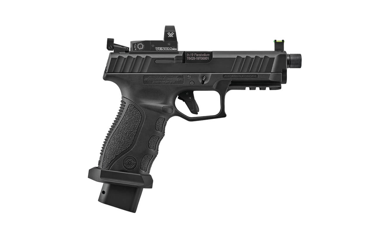 Le STR-9S Combat est optic ready pour le montage d’un viseur, il est livré avec 4 plaques adaptatrices. Canon fileté de 106 mm permettant de fixer un modérateur pour un tir silencieux, organes de visée en fibre optique surélevées pour utilisation à travers le viseur et poignées interchangeables incluses pour un ajustement personnalisé. Le rail d’accessoires du pistolet accepte une grande variété de lampes et de viseurs laser pour les conditions de faible luminosité. Le déclencheur de chargeur réversible permet aux droitiers et aux gauchers de tirer. Le STR-9S Combat est robuste et fiable. Livré avec deux chargeurs de 20 coups.